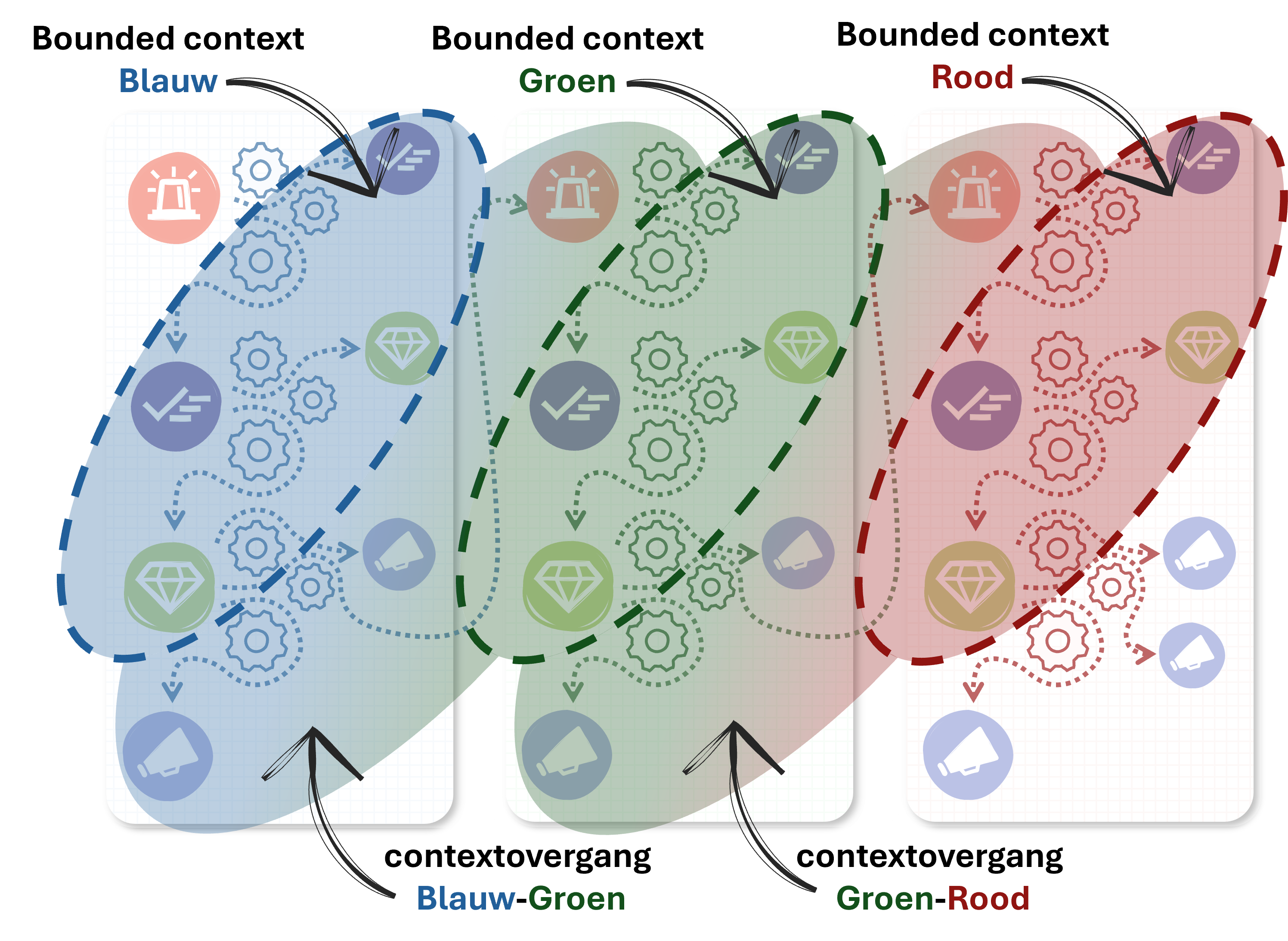 Bounded contexten bestaan zelden in volledige isolatie. Veel vaker zijn ze in ketens of netwerken verbonden met andere bounded contexten. Dit betekent dat een gevolg dat werd geproduceerd in de ene context, in een volgende context wordt beschouwd als aanleiding of trigger voor het produceren van een nieuw gevolg. Bij het oversteken van de grens tussen de twee bounded contexten ontstaat een contextovergang. Hierbij moeten taal en model van de ene context omgezet worden naar taal en model van de andere.